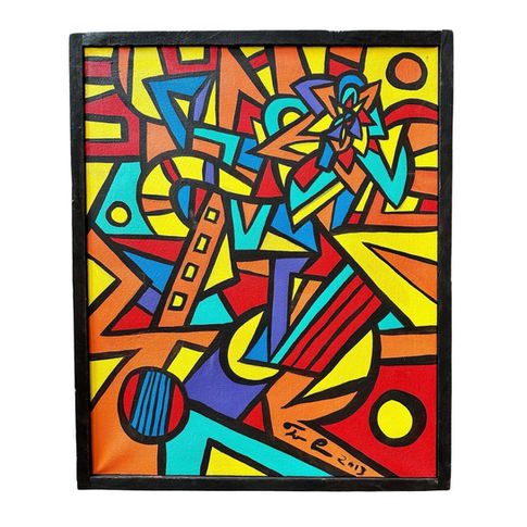 Renowned for his vibrant palette and intricate visual rhythm, Tom Cramer’s Guitar Abstract Composition I exemplifies his signature style—a fusion of street art energy and musical inspiration. With bold outlines, layered shapes, and kinetic geometry, the work evokes the structure and spontaneity of a jazz improvisation.