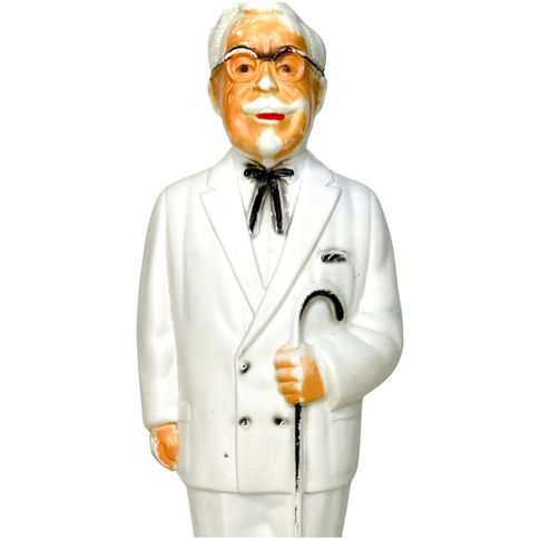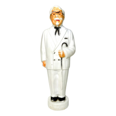 Standing proudly in his signature white suit and string tie, this 12.5-inch plastic bank captures the likeness of Colonel Harland Sanders, the founder and iconic face of Kentucky Fried Chicken.