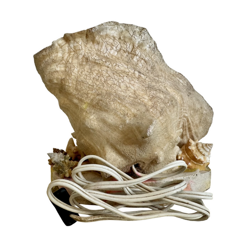 The use of natural materials like conch shells, coral, and sea snails was paired with colorful resin bases and miniature plastic figurines—such as flamingos, palm trees, dolphins, and hula dancers—to create whimsical table décor. Some versions included working lamps with bulbs tucked inside the shells, casting a soft glow through the pearlescent interior.