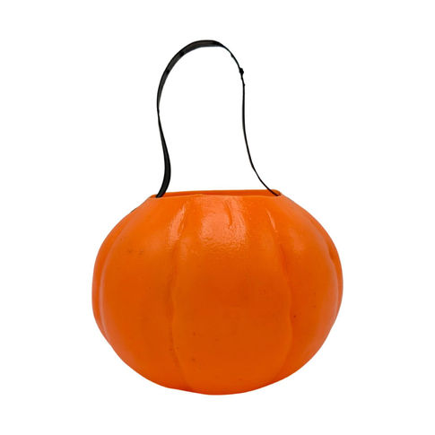 Classic Halloween candy pail in bright orange with a black painted jack-o'-lantern face. A nostalgic staple for spooky season trick-or-treating.