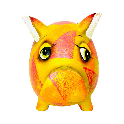 This vibrant plaster piggy bank by Holiday Fair features a bold neon yellow base with hot pink geometric accents and a stylized face. Produced around 1970, it reflects the era’s playful use of color and pattern, blending psychedelic flair with a functional savings tool.
