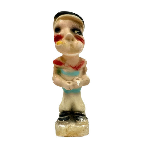 A whimsical Popeye figure rendered in chalkware, showcasing exaggerated features and vibrant primary colors. This piece was likely awarded as a prize at a carnival booth in the 1940s or 1950s, celebrating the beloved comic strip sailor.